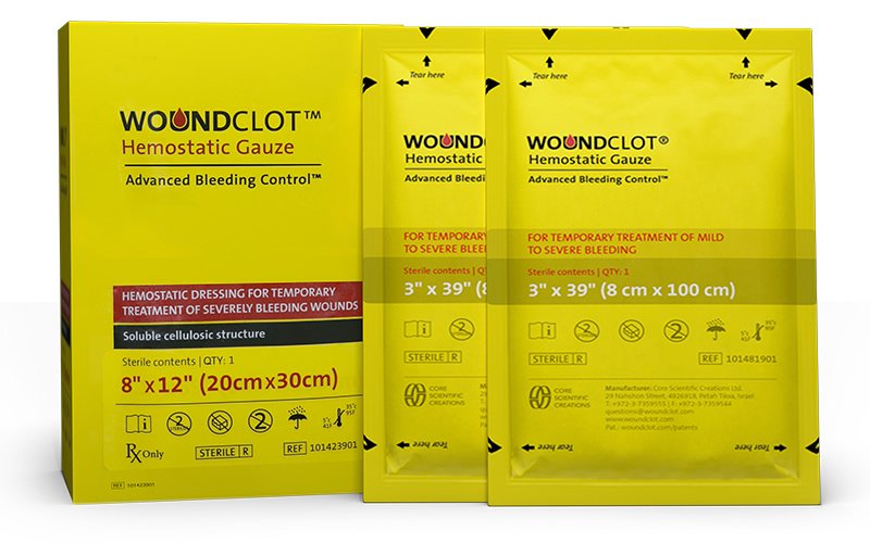 A gaze hemostática WoundClot™ é uma gaze hemostática de última geração, aprovada pela FDA, projetada para ser eficaz no tratamento de sangramentos leves, moderados e graves. WoundClot™ também é eficaz no tratamento temporário de sangramento grave durante procedimentos cirúrgicos, bem como sangramento pós-operatório e no local doador.